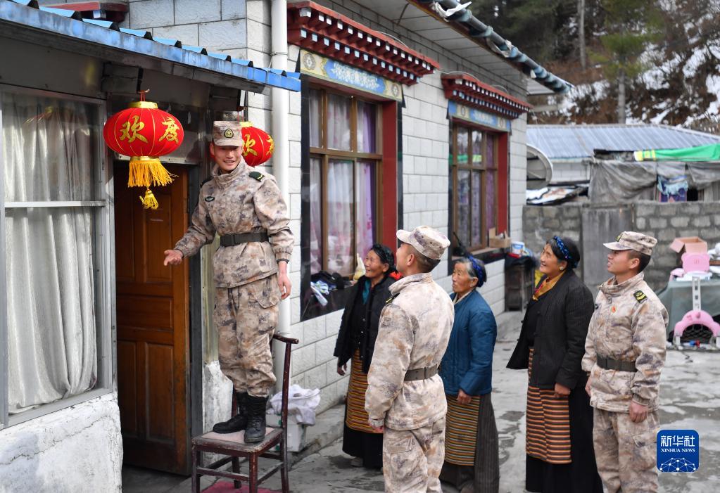 當地官兵到仁青崗村為三位老阿媽裝點(diǎn)房屋,準備迎接春節(1月26日攝)。新華社記者 覺(jué)果 攝