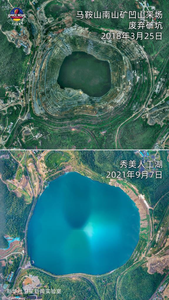 一顆圓形“藍寶石”吸引了我們的目光。查看既往監測數據,這里曾是馬鞍山一座有著(zhù)百年開(kāi)采歷史的凹山采場(chǎng),是華東地區最大的露天鐵礦。歷經(jīng)注水填坑,成為一座巨大的人工湖——凹山湖。2021年6月,當地啟動(dòng)凹山湖生態(tài)修復示范點(diǎn)項目,進(jìn)行土壤修復、流域治理、礦山修復、林木種植等,令廢棄礦山“染”上更多顏色。