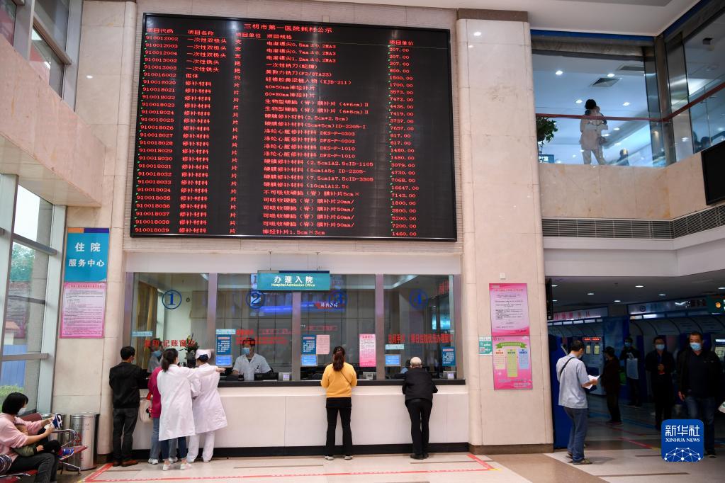 福建省三明市第一醫院的醫保辦工作人員(右)向前來(lái)咨詢(xún)藥品報銷(xiāo)問(wèn)題的居民講解相關(guān)政策(2020年11月18日攝)。新華社記者 姜克紅 攝
