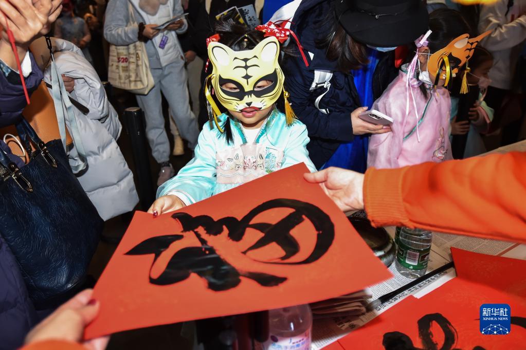 2月15日,在清華大學(xué)藝術(shù)博物館元宵節夜場(chǎng)活動(dòng)上,佩戴虎頭面具的小朋友領(lǐng)取現場(chǎng)書(shū)寫(xiě)的“?!弊?。新華社記者 陳鐘昊 攝