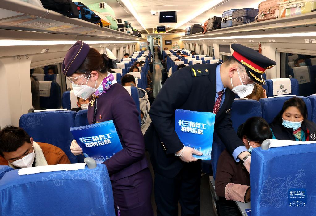 2月12日,列車(chē)乘務(wù)員在重慶開(kāi)往上海的G1334次列車(chē)上,向春運返程務(wù)工人員發(fā)放招聘信息。新華社記者 陳飛 攝