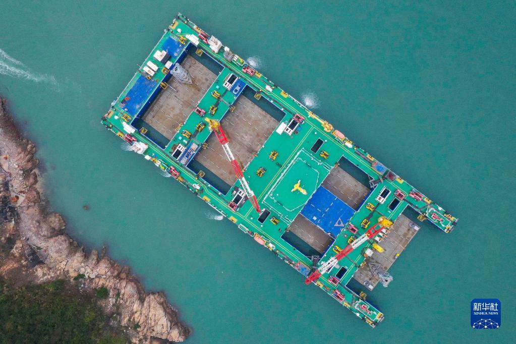 1月14日,中交一航局的“一航津安1”號沉管運輸安裝一體船搭載E16管節準備浮運前往珠江口伶仃洋安裝現場(chǎng)(無(wú)人機照片)。新華社記者 劉大偉 攝