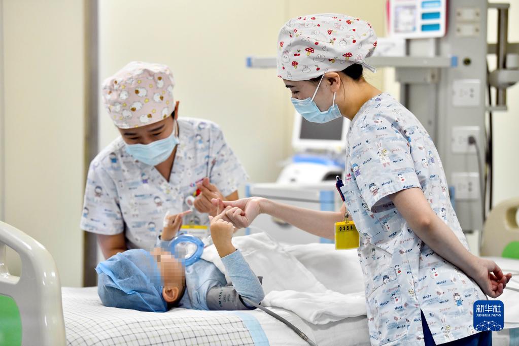 在山東省棗莊市婦幼保健院兒童ICU病房,醫護人員為完成靶向治療藥物諾西那生鈉的4歲脊髓性肌萎縮癥患兒加油鼓勁(1月1日攝)。諾西那生鈉注射液是我國首個(gè)獲批治療脊髓性肌萎縮癥的進(jìn)口藥物,2019年進(jìn)入中國市場(chǎng)時(shí),每針價(jià)格近70萬(wàn)元。在2021年國家醫保目錄藥品談判中,以3.3萬(wàn)元每針的價(jià)格進(jìn)入新版醫保藥品目錄。新華社記者 郭緒雷 攝