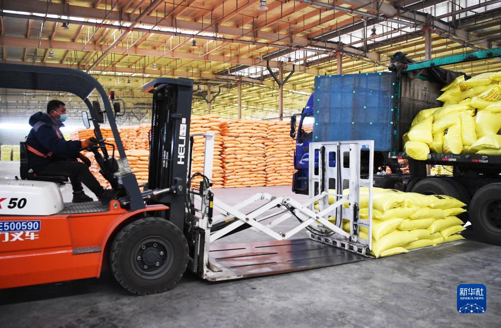 2月17日,工人在位于河南省安陽(yáng)市湯陰縣伏道鎮的河南萬(wàn)莊安陽(yáng)物流園裝運儲備化肥。新華社記者 張浩然 攝