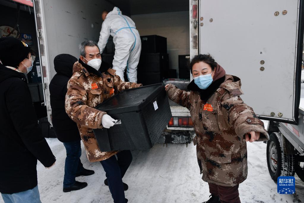 趙淑華(右一)指揮社區工作人員和志愿者搬運盒飯(2021年2月15日攝)。趙淑華是吉林省通化市東昌區團結街道文化社區副主任、網(wǎng)格長(cháng),臨近退休的她毫不猶豫投身抗疫一線(xiàn)。新華社記者 許暢 攝