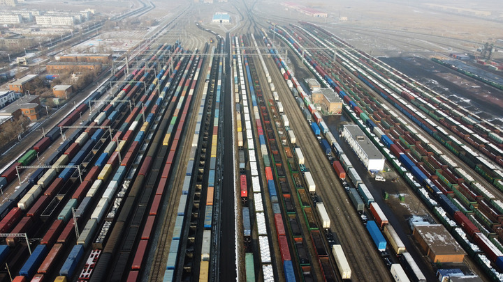 新疆阿拉山口口岸內出入境班列正集結出發(fā)。新華社照片
