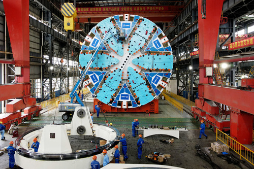 2020年10月15日,在隧道股份上海隧道工程有限公司機械制造分公司生產(chǎn)車(chē)間,工人對“騏躍”盾構機進(jìn)行安裝調試。新華社記者 方喆 攝