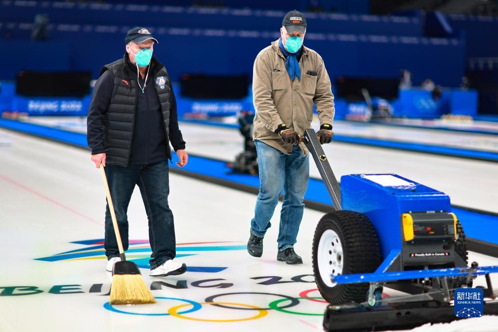 圖為加拿大的制冰師漢斯·烏斯里奇(左)在“冰立方”指導團隊成員使用制冰設備(2022年1月28日攝)。新華社記者 劉續 攝