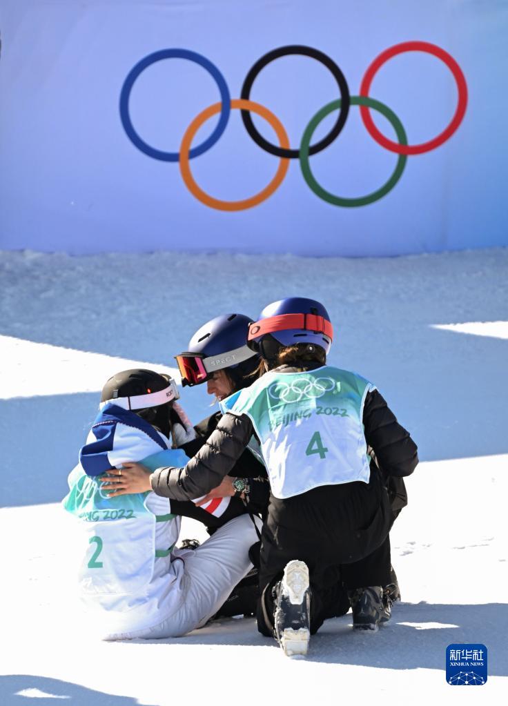 圖為在北京2022年冬奧會(huì )自由式滑雪女子大跳臺決賽后,中國選手谷愛(ài)凌(右)和瑞士選手瑪蒂爾德·格雷莫德(中)安慰法國選手苔絲·勒德(2022年2月8日攝)。新華社記者 武巍 攝
