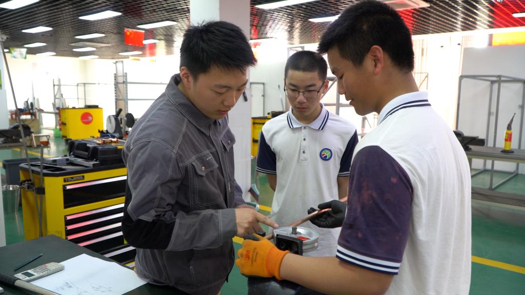 4月12日,在安吉技師學(xué)院的教學(xué)車(chē)間里,楊應政(左一)正在手把手教授學(xué)生如何做好規定角度的鋼管煨彎工藝。新華社記者李濤 攝
