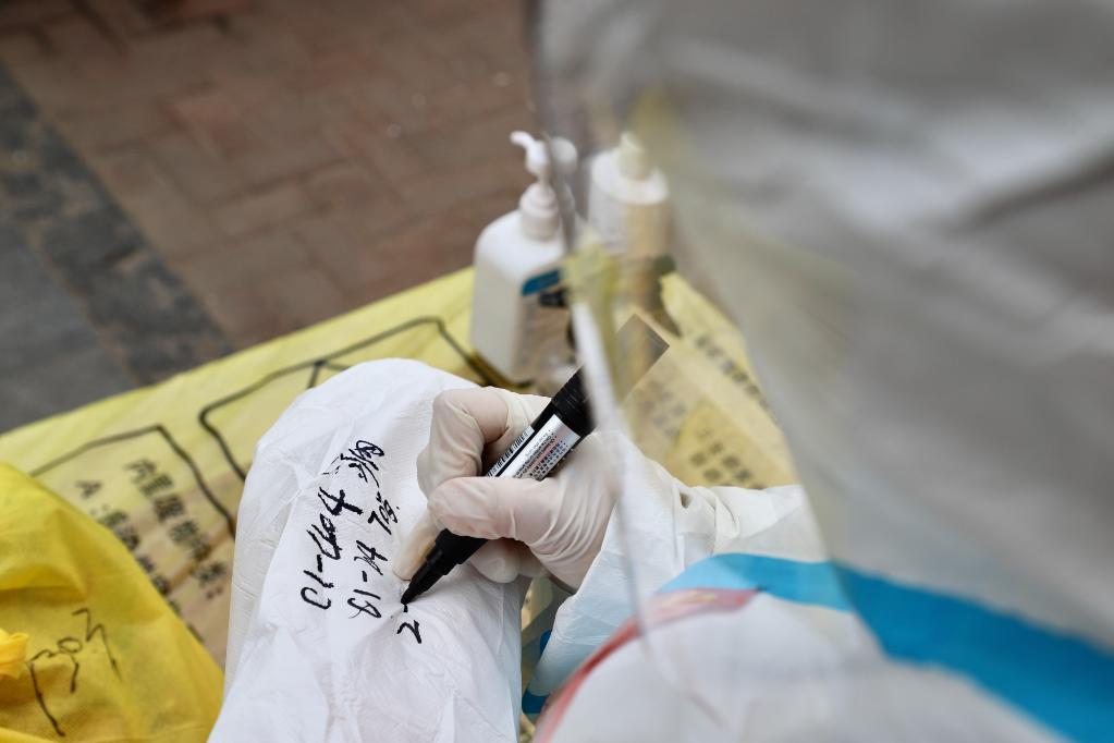 何文娟在衣袖上備注居民的需求。新華社記者 徐凱鑫 攝