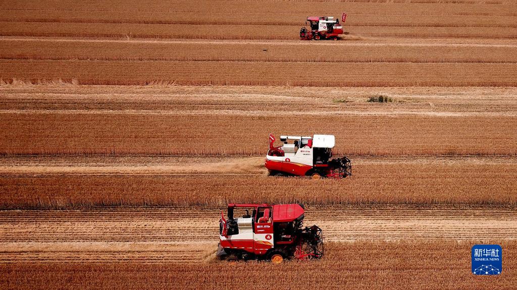 在山東滕州市官橋鎮,全國糧食機收減損技能大比武山東省賽區參賽選手操作收割機收割小麥(2021年6月4日,無(wú)人機照片)。新華社記者 郭緒雷 攝