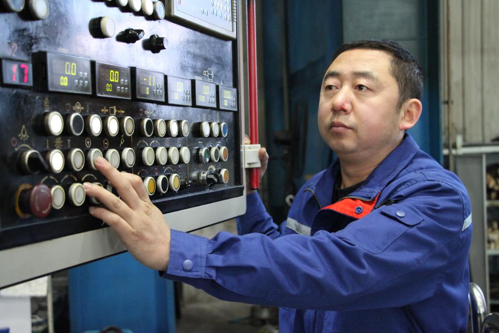 “大工匠”桂玉松正在一臺大型數控機床前,兩眼緊盯著(zhù)一塊重達百?lài)嵉膶?shí)心鋼坯,輕觸操控案板,伴隨著(zhù)機床輕微的轉動(dòng)聲,特制的刀具便伴著(zhù)潤滑油,探入鋼坯的內部。