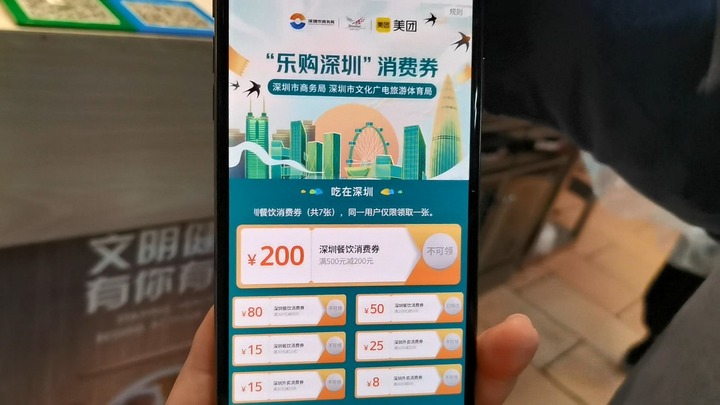 深圳自“五一”起,通過(guò)美團、京東等平臺陸續發(fā)放5億元消費券,涉及購物、餐飲、文體旅游、數字人民幣紅包等方面。(美團 供圖)