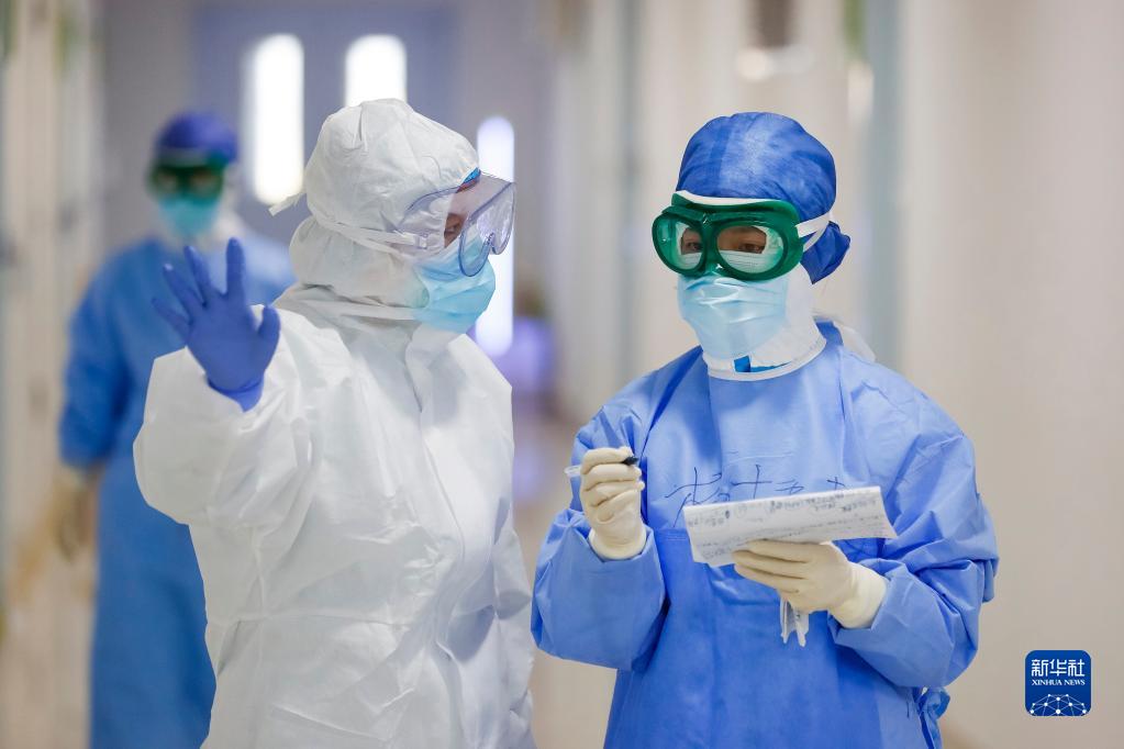 在武漢市金銀潭醫院的一個(gè)病區,金銀潭醫院護士與浙江省人民醫院護士(右)交接工作(2020年3月18日攝)。新華社記者 沈伯韓 攝