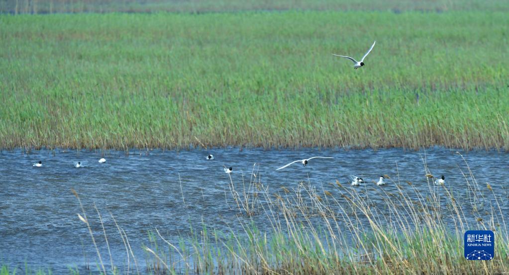 5月5日在盤(pán)錦市遼河口濕地南小河黑嘴鷗繁殖區拍攝的黑嘴鷗。新華社記者 楊青 攝