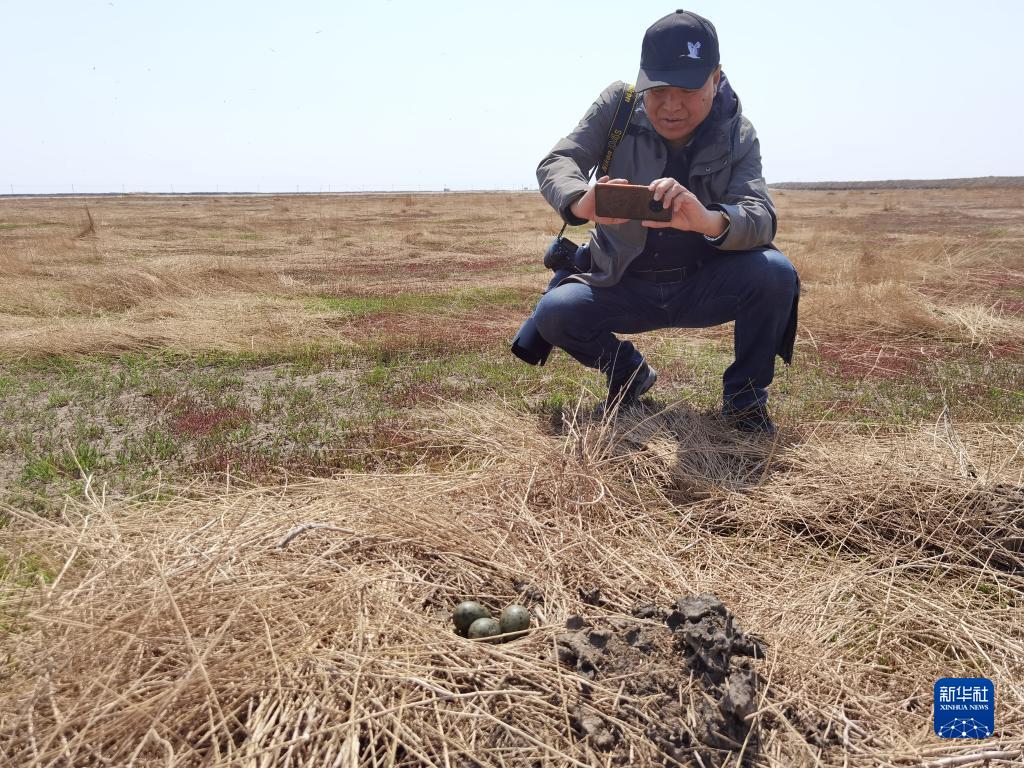 4月29日,盤(pán)錦市林業(yè)和濕地保護服務(wù)中心主任李玉祥在查看黑嘴鷗孵蛋情況。新華社發(fā)