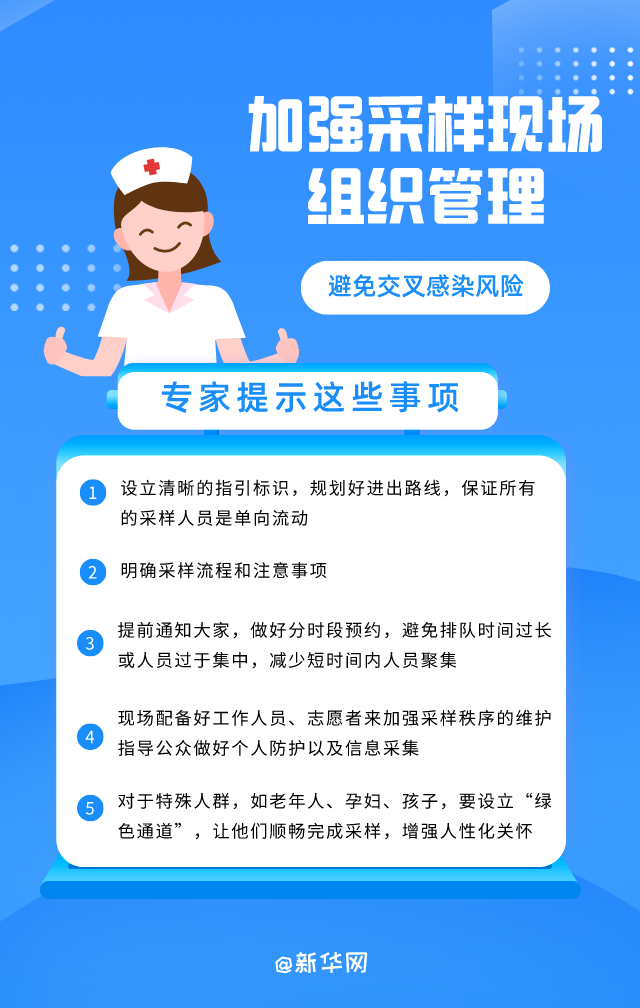 采樣現場(chǎng)大家排隊做核酸,如何避免交叉感染風(fēng)險?郭燕紅對于加強采樣現場(chǎng)組織管理方面,給出以下提示: