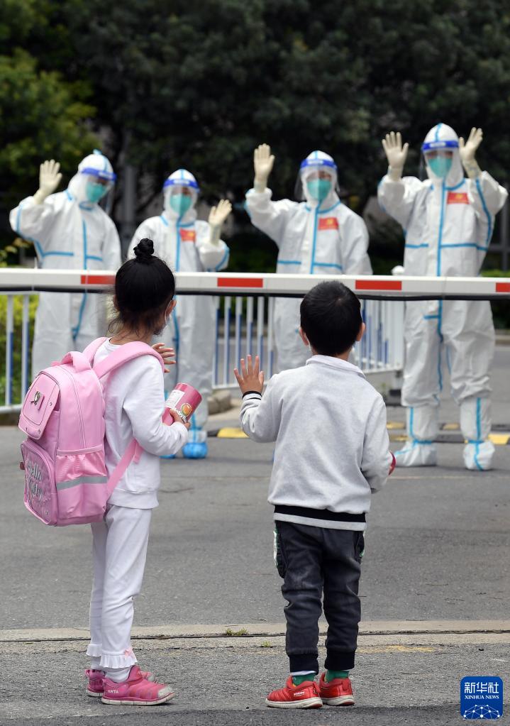 4月30日,走出醫院準備回家時(shí),小華(右)和姐姐回身向護送他們出院的醫護人員揮手道別。當日,由上海交通大學(xué)醫學(xué)院附屬仁濟醫院南部院區(新冠定點(diǎn)醫院)收治的3歲重癥新冠患者小華(化名)出院。新華社記者 李賀 攝