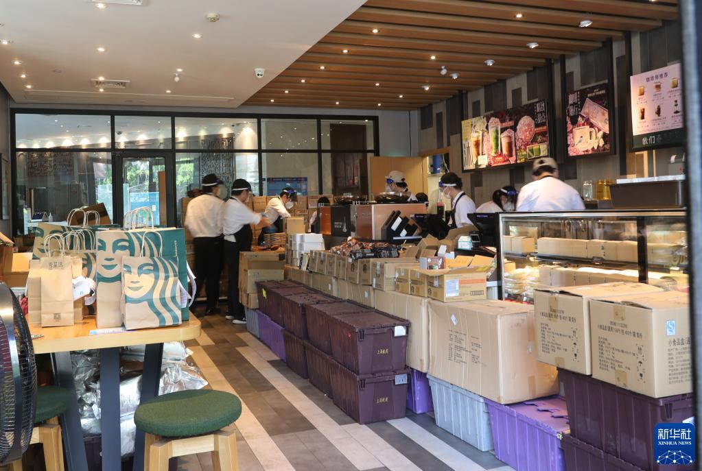 5月17日,工作人員在位于上海市徐匯區的一家星巴克咖啡店內制作網(wǎng)絡(luò )訂單貨品。新華社記者 方喆 攝