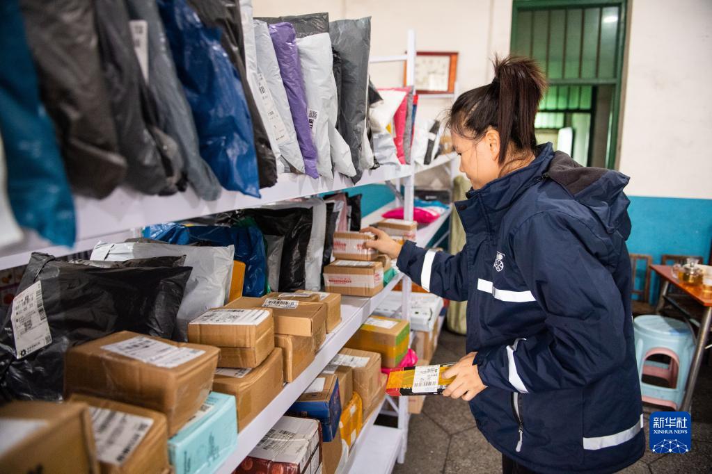 湖南省衡陽(yáng)市耒陽(yáng)市黃市鎮新生快遞鄉村服務(wù)站的站長(cháng)胡夏在整理快遞(2021年11月3日攝)。新華社記者 陳思汗 攝