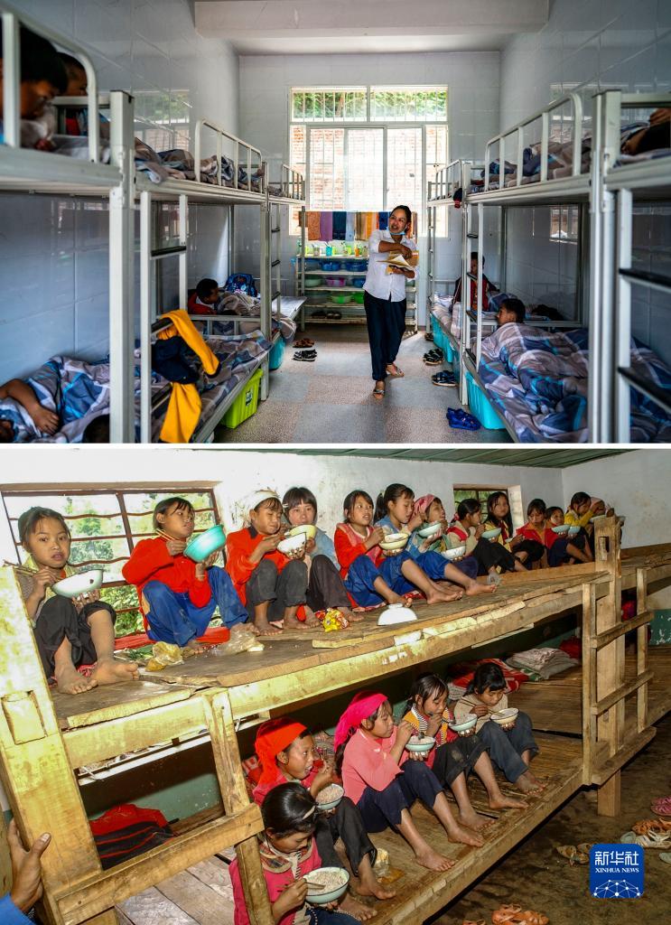 拼版照片:上圖為2021年9月8日,云南省瀾滄拉祜族自治縣木戛鄉哈卜嗎村小學(xué)的學(xué)生在宿舍休息(新華社記者江文耀攝);下圖為2003年,哈卜嗎村小學(xué)的學(xué)生在宿舍吃飯(新華社記者秦晴攝)。新華社發(fā)