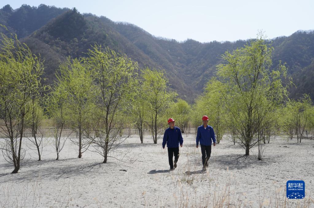 金堆城鉬業(yè)集團有限公司工作人員在經(jīng)過(guò)生態(tài)治理后的木子溝尾礦庫內巡查(4月7日攝)。新華社記者 邵瑞 攝