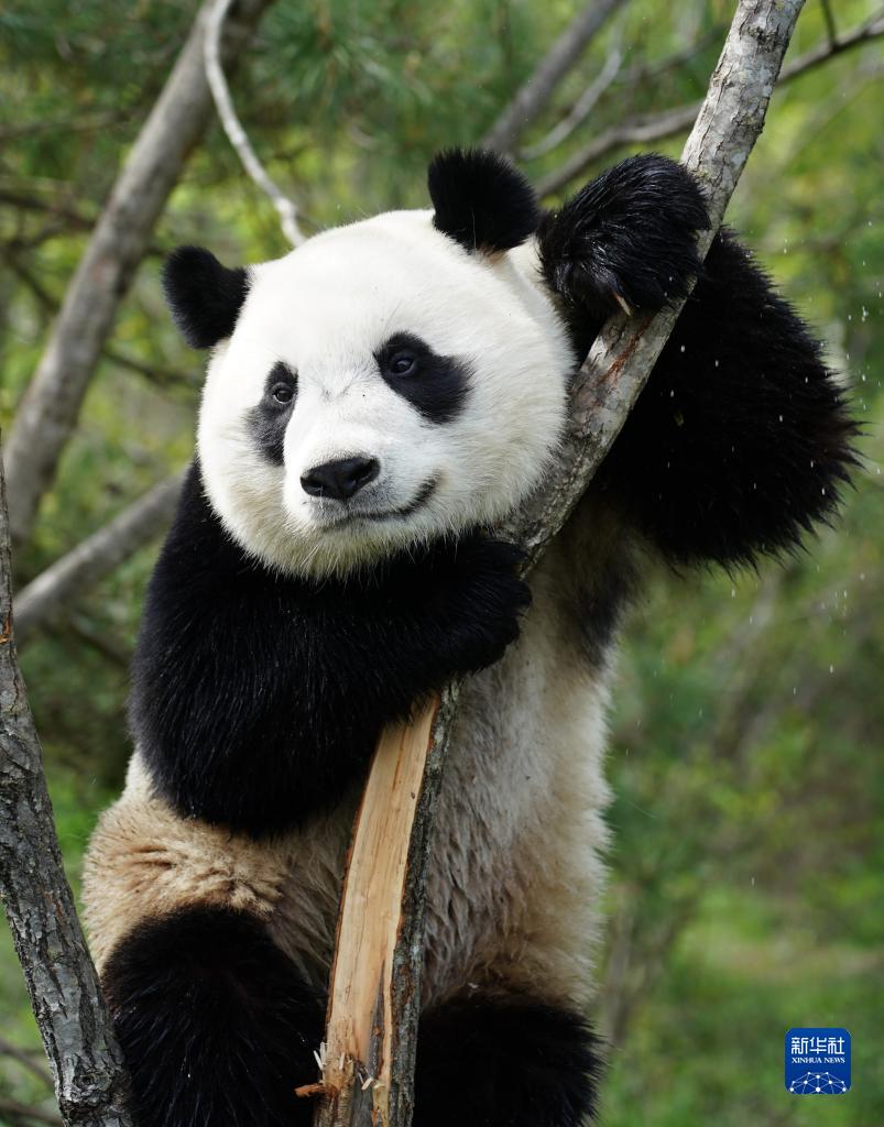大熊貓“善仔”在陜西洋縣華陽(yáng)鎮“秦嶺四寶園”熊貓谷爬樹(shù)(4月18日攝)。新華社記者 邵瑞 攝
