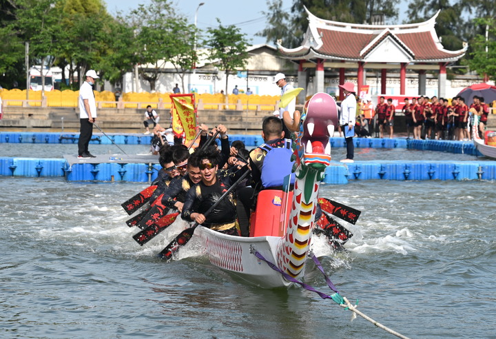 6月2日,“海芋·臺胞社工隊”在“龍騰虎躍”2022海峽兩岸龍舟賽300米直道賽的預賽中沖過(guò)終點(diǎn)。新華社記者林善傳攝
