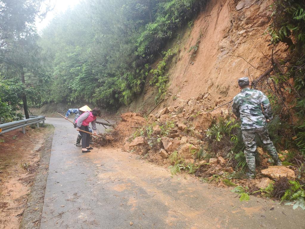 6月13日,福建省南平市光澤縣李坊鄉上觀(guān)村組織人員清理道路溜方。(新華社發(fā))