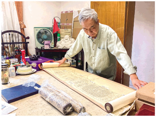 郭相穎為記者展示當年手繪的寶頂山摩崖造像圖。記者劉恩黎攝