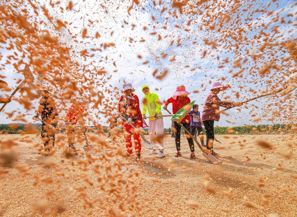 6月13日,在山東省榮成市上莊鎮大李家村晾曬場(chǎng),村民們在晾曬小麥。(新華社發(fā))