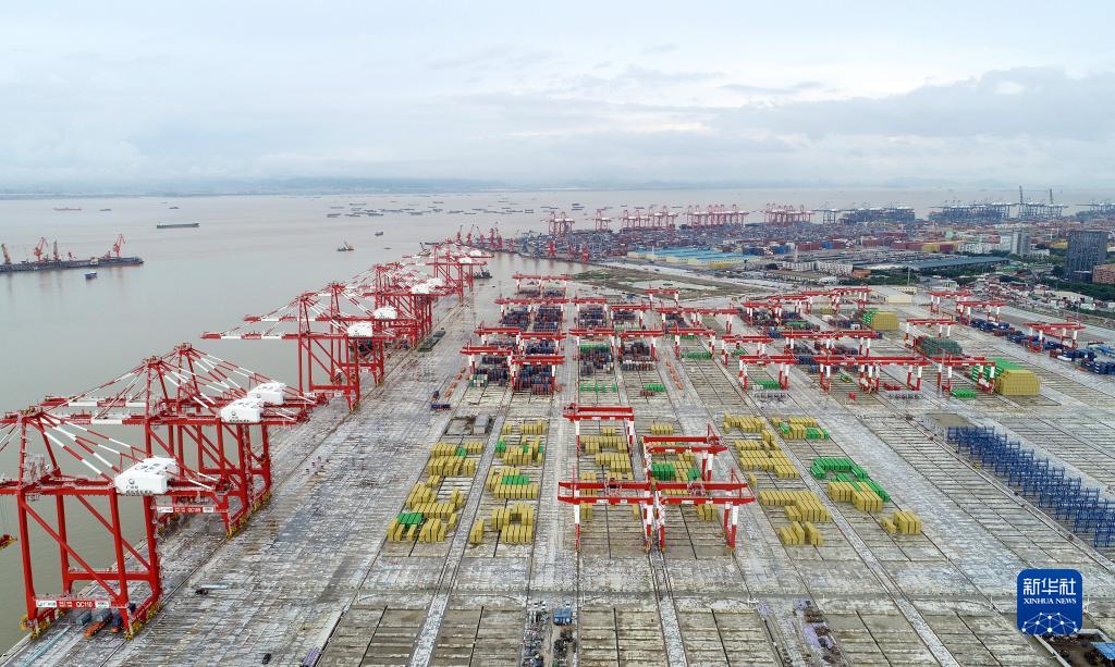 南沙港四期全自動(dòng)化碼頭(6月16日攝,無(wú)人機照片)。新華社記者 盧漢欣 攝