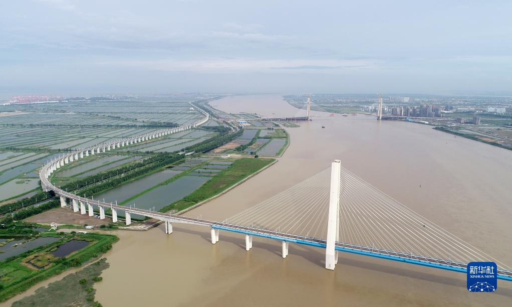 南沙港鐵路的跨江鐵路橋(6月16日攝,無(wú)人機照片)。新華社記者 盧漢欣 攝