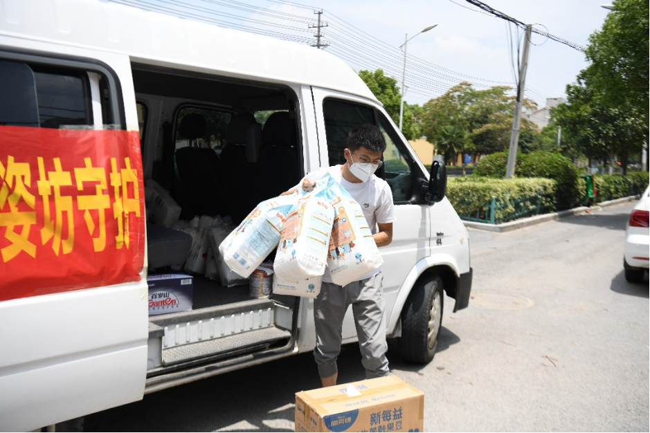 7月3日,在泗縣桃李文苑小區,一母嬰用品店的工作人員在為小區居民配送母嬰用品。新華社記者黃博涵 攝
