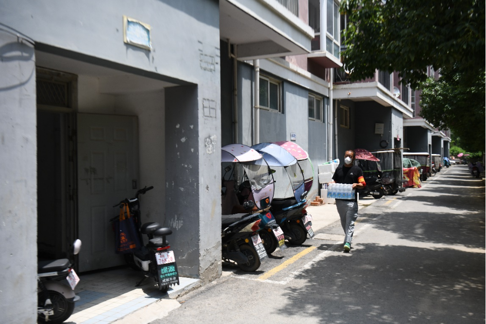 7月3日,在泗縣虹鄉家園小區,“小區長(cháng)”孟軍為小區居民配送生活物資。新華社記者黃博涵 攝