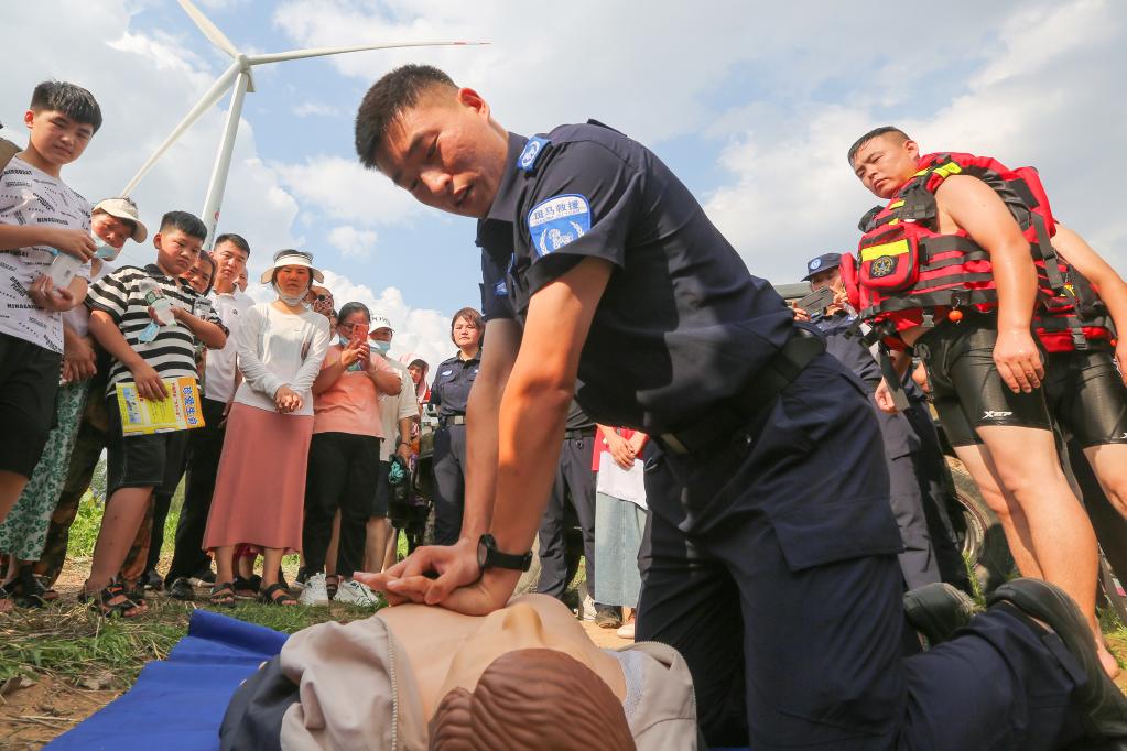 7月12日,河南省商丘市夏邑縣會(huì )亭鎮聯(lián)合夏邑縣斑馬救援隊開(kāi)展暑期防溺水安全主題教育活動(dòng),救援隊隊員為農村兒童和家長(cháng)普及預防溺水知識,提高救助能力。新華社發(fā)(王高超 攝)