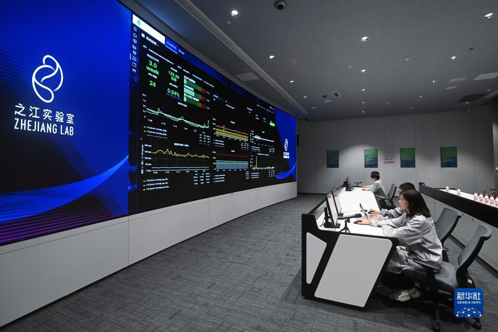 在之江實(shí)驗室計算與數據中心,工程師們通過(guò)“之江云”系統監測服務(wù)器集群的運行狀態(tài)(2022年6月23日攝)。新華社記者 黃宗治 攝