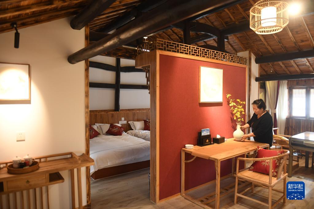 服務(wù)員在浙江省磐安縣烏石村一家民宿內整理房間(2019年4月24日攝)。新華社記者 翁忻旸 攝