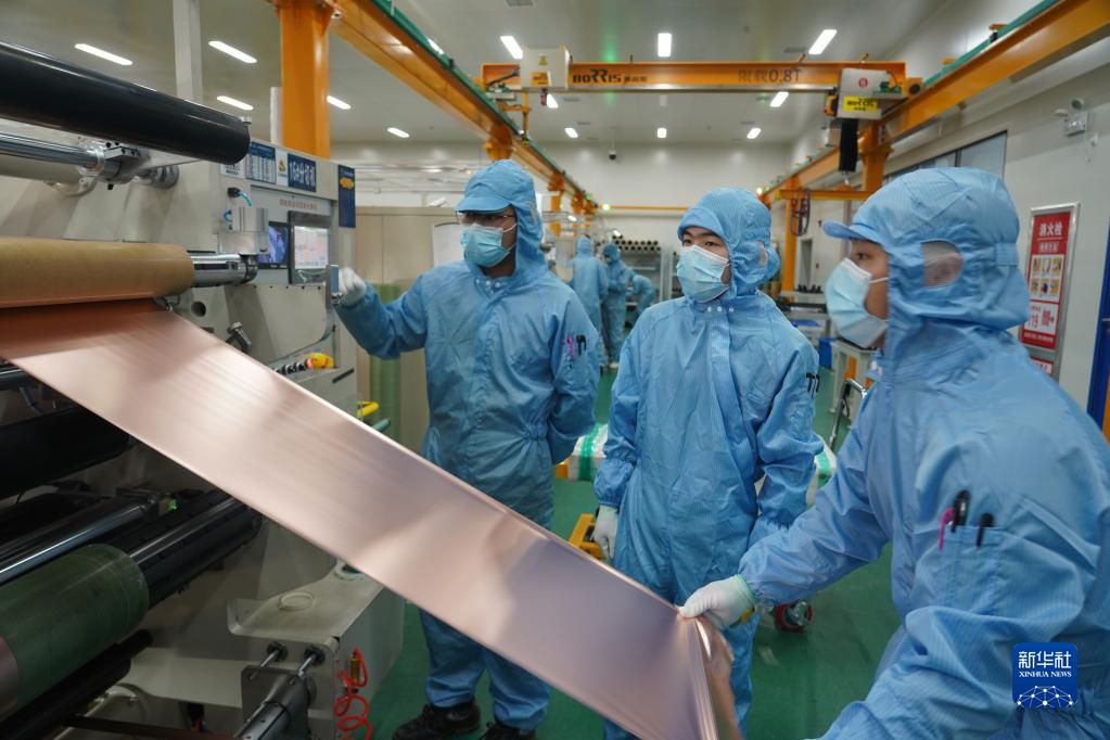 在位于江西南昌高新區的江銅耶茲銅箔有限公司,工人進(jìn)行鋰電銅箔分切工序(2022年5月12日攝)。新華社記者 周密 攝