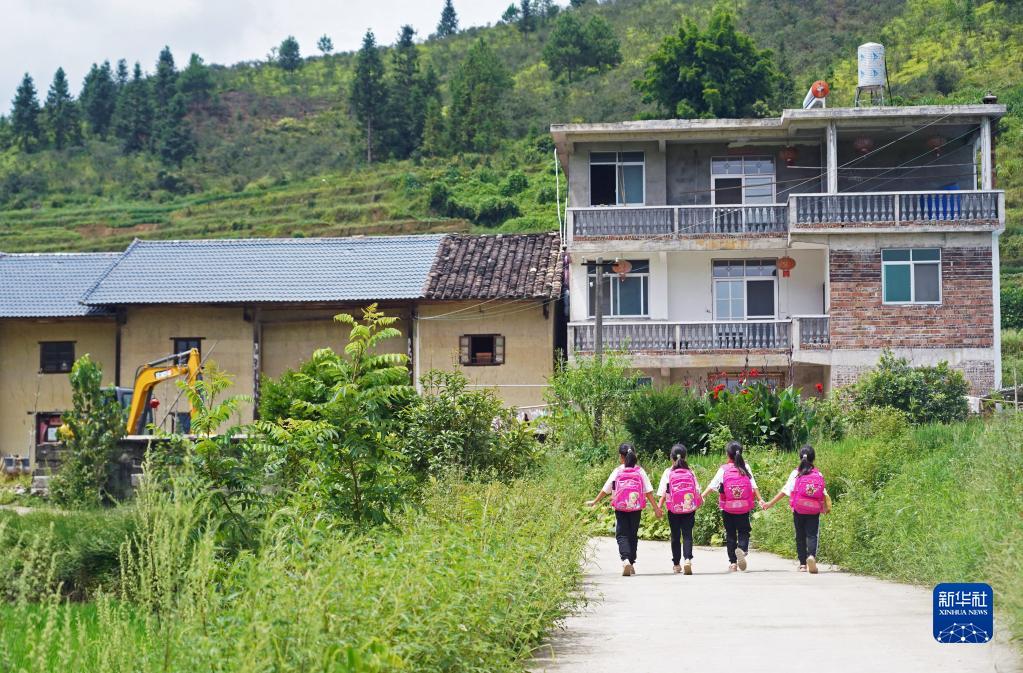 在江西省贛州市崇義縣上堡鄉上堡村,孩子們走在放學(xué)回家的路上(2020年9月10日攝)。遠處是一戶(hù)村民的土坯房祖屋和新建的三層小樓。新華社記者 萬(wàn)象 攝