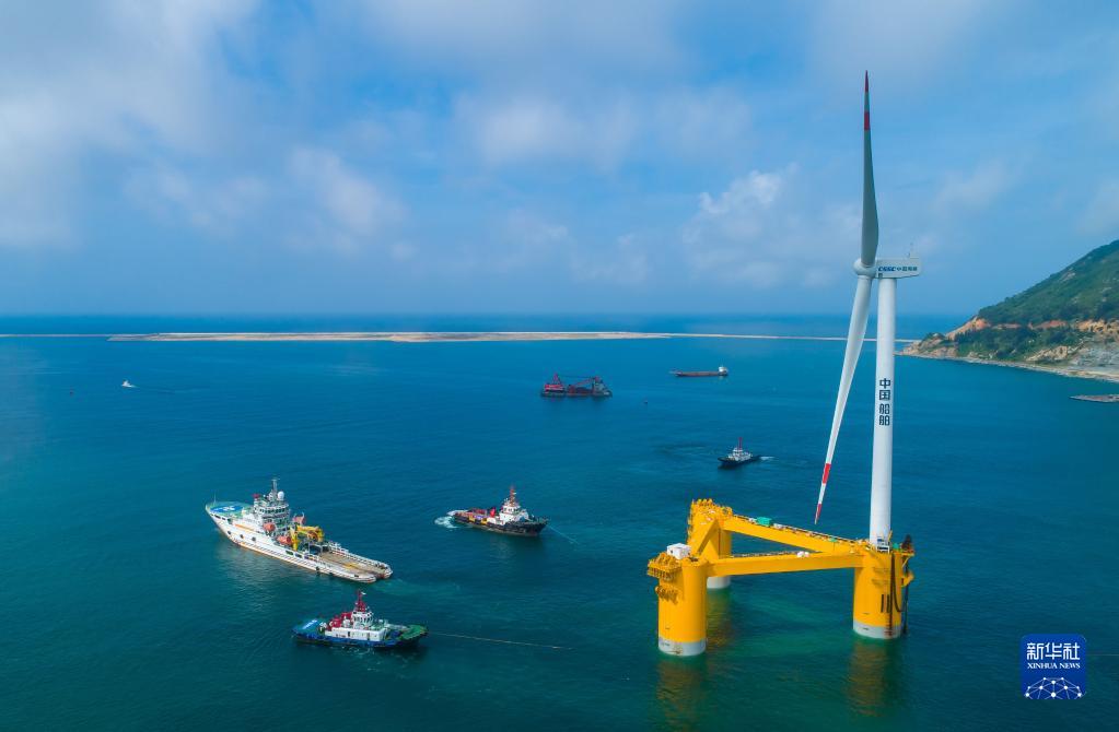 國內首臺深遠海浮式風(fēng)電裝備“扶搖號”從廣東省茂名市廣港碼頭拖航前往羅斗沙海域進(jìn)行示范應用(2022年5月29日攝,無(wú)人機照片)。新華社記者 劉大偉 攝