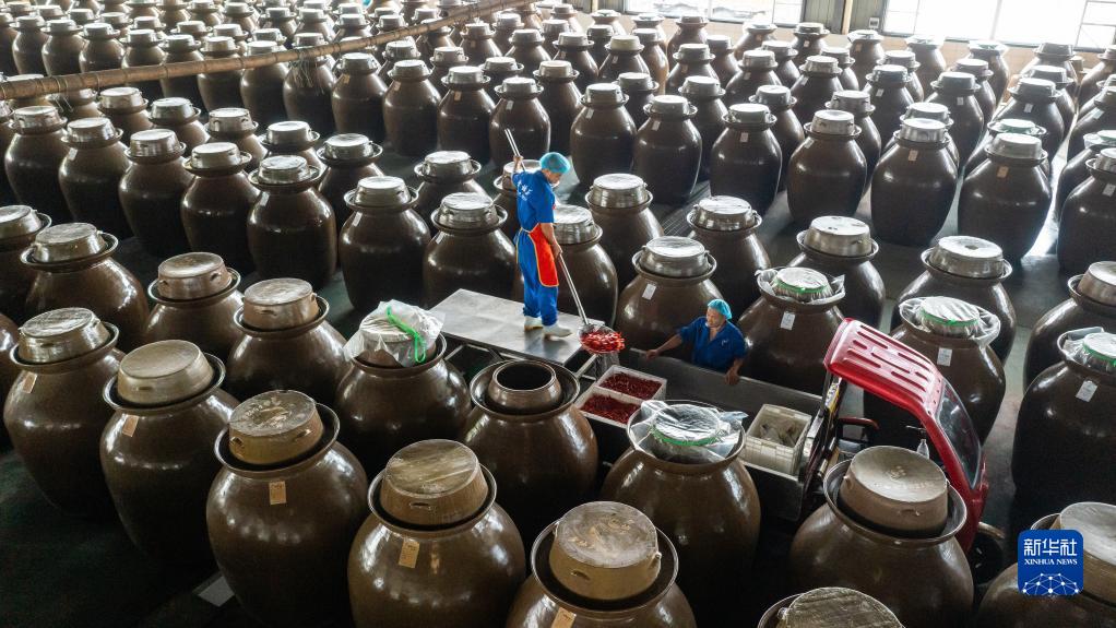 位于四川省眉山市的四川老壇子食品有限公司的工人在撈取已經(jīng)腌制好的泡菜(2022年6月24日攝,無(wú)人機照片)。新華社記者 沈伯韓 攝