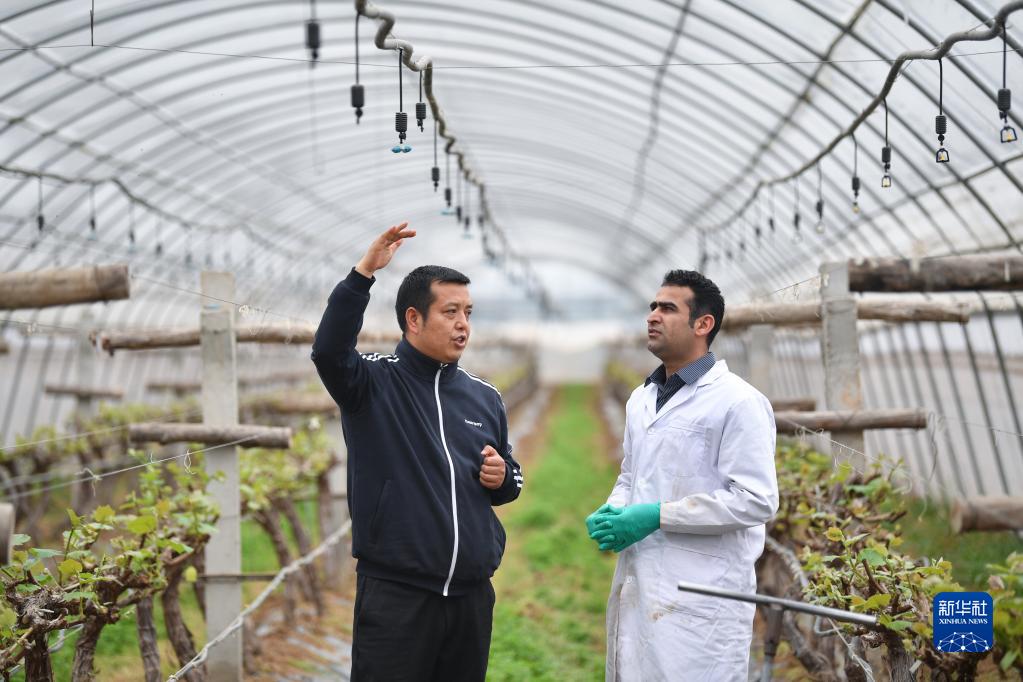 2021年3月17日,來(lái)自巴基斯坦的留學(xué)生(右)在陜西楊凌錦田農業(yè)專(zhuān)業(yè)合作社向當地職業(yè)農民了解水肥一體化灌溉設備。新華社記者 張博文 攝