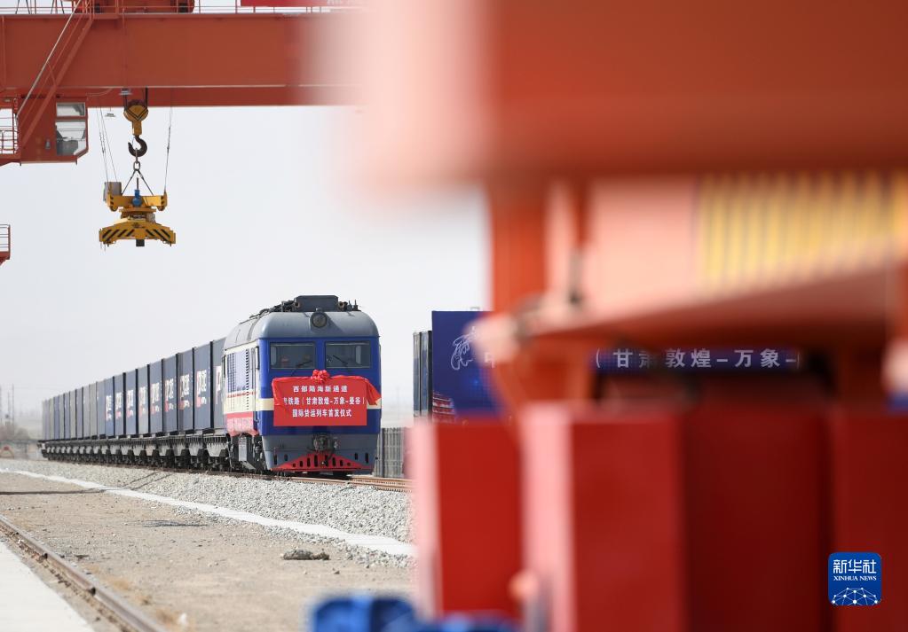 2022年4月21日,甘肅首趟中老鐵路國際貨運列車(chē)在敦煌市鐵路西貨站綜合貨場(chǎng)等待發(fā)車(chē)。新華社記者 陳斌 攝