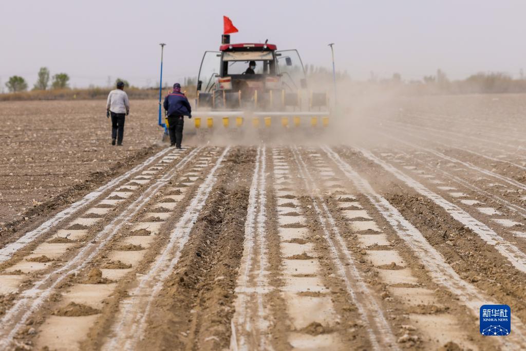 在新疆生產(chǎn)建設兵團第六師共青團農場(chǎng)的棉田里,職工操作搭載北斗導航系統的播種機進(jìn)行春播(2022年4月19日攝)。新華社記者 丁磊 攝