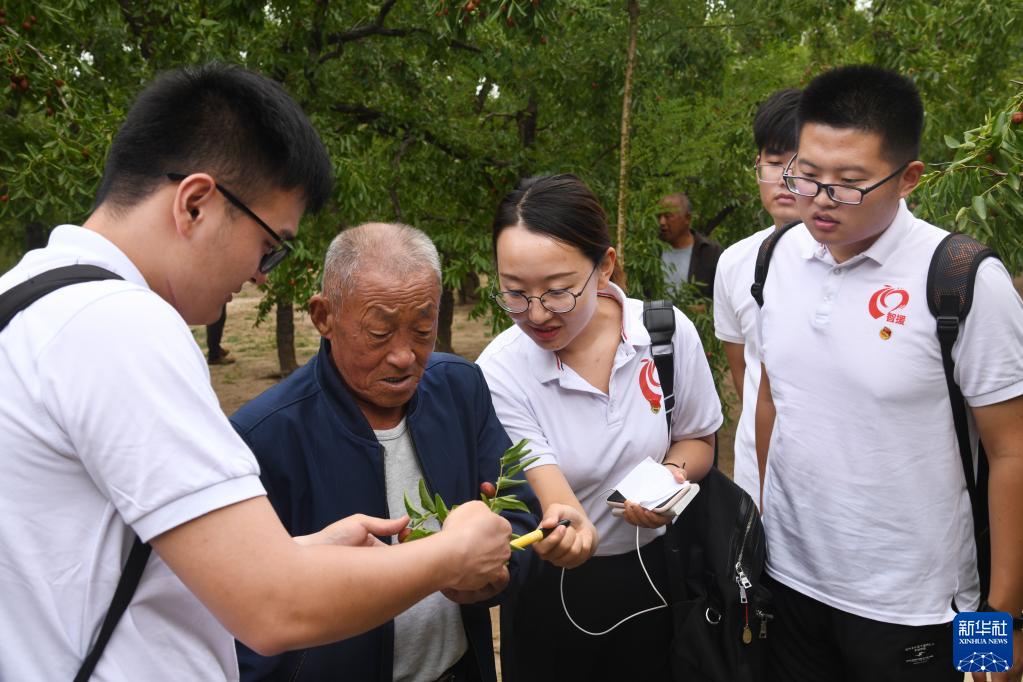中國海洋大學(xué)紅旗智援博士團成員在山東省樂(lè )陵市朱集鎮大常村棗林向果農了解果樹(shù)種植情況(2019年9月19日攝)。新華社記者 李紫恒 攝