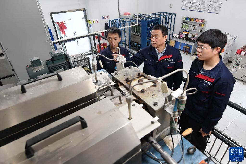 福建閩江學(xué)院服裝與藝術(shù)工程學(xué)院教授李永貴(中)在“福建省新型功能性紡織纖維及材料重點(diǎn)實(shí)驗室”教學(xué)生做紡絲實(shí)驗(2021年3月22日攝)。新華社記者 林善傳 攝