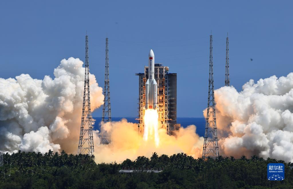 搭載問(wèn)天實(shí)驗艙的長(cháng)征五號B遙三運載火箭,在我國文昌航天發(fā)射場(chǎng)點(diǎn)火發(fā)射(2022年7月24日攝)。新華社記者 李剛 攝