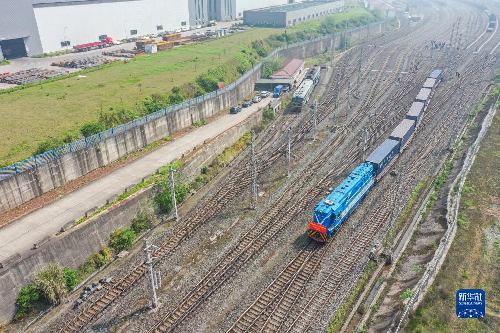 中緬新通道(重慶—臨滄—緬甸)國際鐵路班列從重慶果園港魚(yú)嘴車(chē)站順利發(fā)車(chē)(無(wú)人機照片,2022年5月23日攝)。新華社記者 唐奕 攝